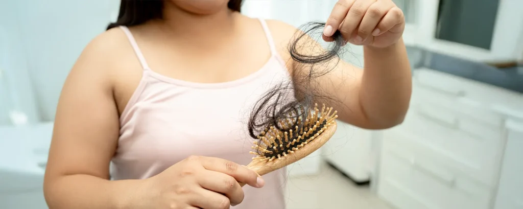 Women often notice clumps of hair in the shower, more strands on brushes and thinning that is especially visible along the temples. The overall hair may look flatter, limp or less voluminous. As recovery begins, short baby hairs start appearing along the hairline, indicating that new growth is underway even while shedding continues elsewhere.