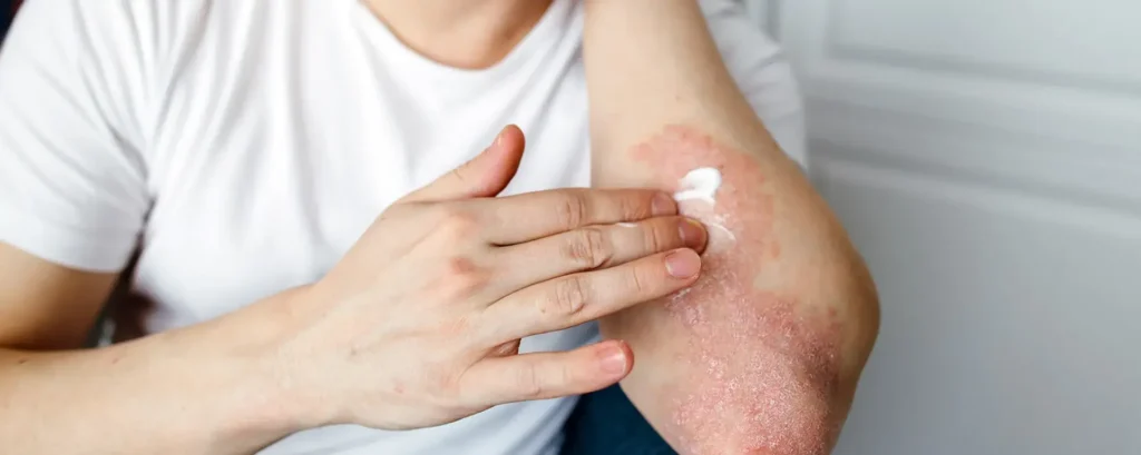 Psoriasis is an autoimmune condition that causes the body to produce skin cells too quickly. This leads to scaly, raised, silvery patches that often appear on the elbows, knees, and scalp.