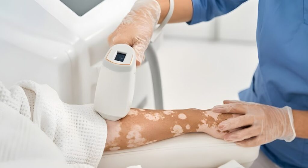 One of the most useful tools your dermatologist may use is the Wood’s lamp. This device emits ultraviolet light, which makes depigmented areas of your skin more visible. Under this light, vitiligo patches appear bright white and stand out clearly. This allows your doctor to see changes that may not be noticeable in normal lighting.