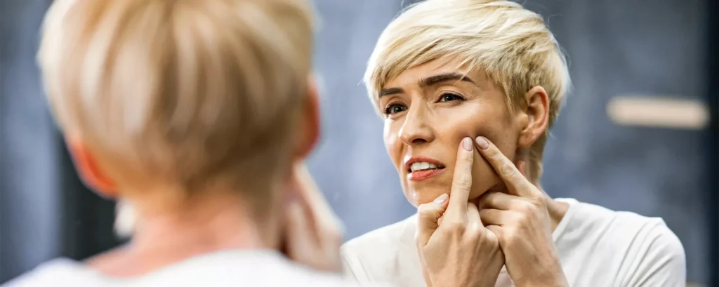 On top of that, using heavy cosmetics, harsh cleansers, or skincare products not suited to your skin type can clog pores and worsen breakouts. Some people may also develop spots as a reaction to medication or due to environmental factors like pollution. Because your skin’s ability to regenerate slows with age, blemishes may take longer to heal and can leave behind marks or pigmentation that linger longer than they did in your teenage years.
